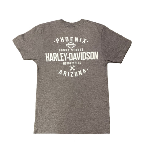 Born from desert heat and garage grit, this exclusive Buddy Stubbs design hits hard with a rock-inspired edge. The front features a bold AZ-HD stamp—sun-scorched and unapologetic. On the back, two crossed wrenches form a defiant emblem of custom culture and dealership pride. It’s a tribute to the riders who build, break, and rebuild—true to the road, true to the wrench.