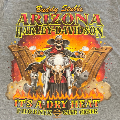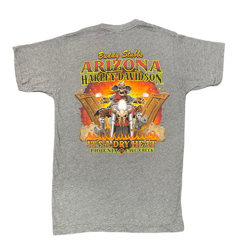 Turn up the desert swagger with this exclusive Buddy Stubbs Harley-Davidson charcoal Poly-blend tee, a tribute to Arizona's sun-scorched soul and rebellious spirit. Crafted for those who ride through the heat like it's just another breeze, this tee blends grit, humor, and heritage in one unforgettable design
