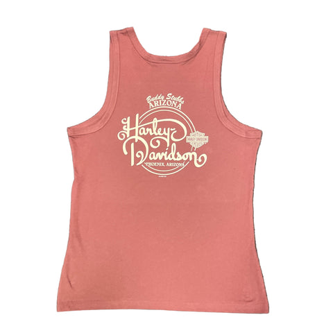 Elegance with edge. This maroon tank top blends bold Harley-Davidson attitude with delicate design, featuring a stylized script logo framed by golden flourishes and dotted accents. Lightweight and breathable, it’s made for warm rides, layered looks, and unapologetic self-expression.