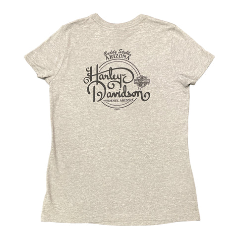 This Buddy Stubbs Harley-Davidson women's tee amps up the attitude with a high-voltage H-D logo in vivid blue and purple tones. It's a tribute to the rebel spirit-where heritage meets street-ready edge. Soft polyblend comfort, classic fit, and unmistakable style. Made for those who ride loud and live louder.