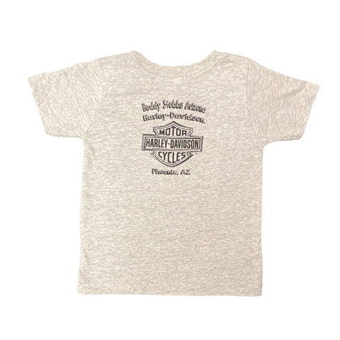 Let your little rider rep the legend in style. This Grey short sleeve tee is crafted from soft, all-natural cotton knit for comfort that lasts through every adventure. The front features the iconic Open Bar & Shield logo, bold and unmistakable, while the back showcases Buddy Stubbs Harley-Davidson.