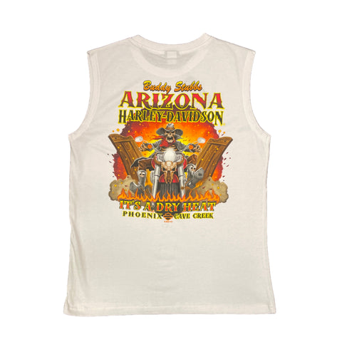 Turn up the desert swagger with this exclusive Buddy Stubbs Harley-Davidson white sleeveless, a tribute to Arizona's sun-scorched soul and rebellious spirit. Crafted for those who ride through the heat like it's just another breeze, this tee blends grit, humor, and heritage in one unforgettable design