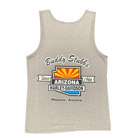 This tank top features a striking rendition of the Arizona State Flag-radiating copper star power and sunburst pride on the left chest. The bold orange hue channels the heat of the desert and the fire of rebellion, making it a perfect canvas for riders who live by their own rules. Whether you're cruising through canyon curves or kicking back roadside, this tee is built to turn heads and honor the spirit of the Southwest.