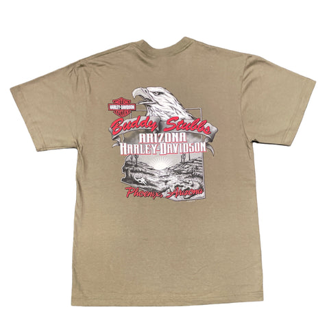 Subtle color. Strong identity. The HD Stamp Pocket Tee delivers everyday comfort in a rugged grape leaf hue, grounded by a round Harley-Davidson stamp graphic in earthy brown and beige tones. Featuring the iconic Buddy Stubbs Arizona dealer back print. Made from soft cotton jersey, it’s finished with a chest pocket for utility and a relaxed fit that’s built to move. Whether you’re riding or unwinding, this tee keeps the legacy close to the chest.