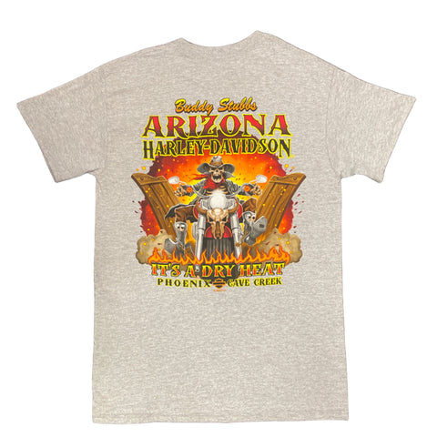 Turn up the desert swagger with this exclusive Buddy Stubbs Harley-Davidson grey t-shirt, a tribute to Arizona's sun-scorched soul and rebellious spirit. Crafted for those who ride through the heat like it's just another breeze, this tee blends grit, humor, and heritage in one unforgettable design