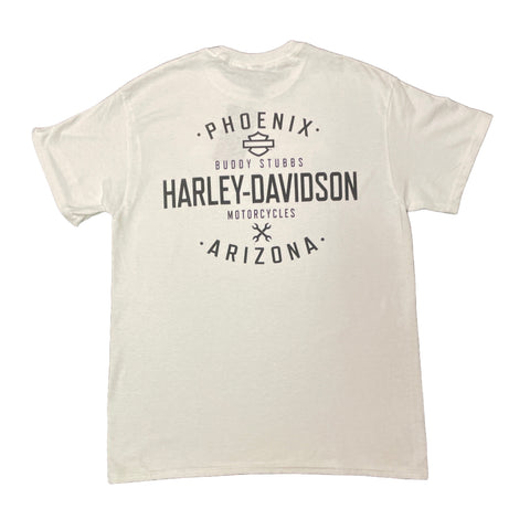 Born from desert heat and garage grit, this exclusive Buddy Stubbs design hits hard with a rock-inspired edge. The front features a bold AZ-HD stamp—sun-scorched and unapologetic. On the back, two crossed wrenches form a defiant emblem of custom culture and dealership pride. It’s a tribute to the riders who build, break, and rebuild—true to the road, true to the wrench.